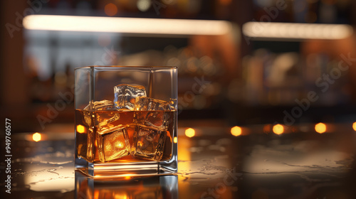 A glass of whiskey sits on a bar counter