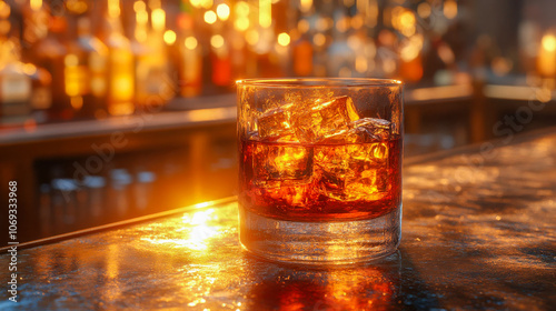 A glass of whiskey with ice cubes, set on a warmly lit bar counter, evoking sophistication and relaxation in a bar setting