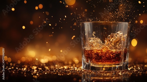 A glass of whiskey with ice is surrounded by golden bokeh and sparkles, creating a luxurious and celebratory atmosphere against a dark, blurred background.