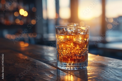 A glass of whiskey with ice placed on a wooden surface with a warm sunset backlighting creating a cozy atmosphere