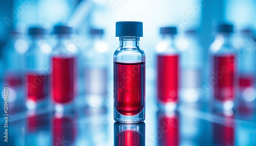 A glass vial filled with a bright red liquid stands prominently amid multiple blurred vials. The setting is a laboratory, illuminated with soft blue light, creating an intriguing atmosphere