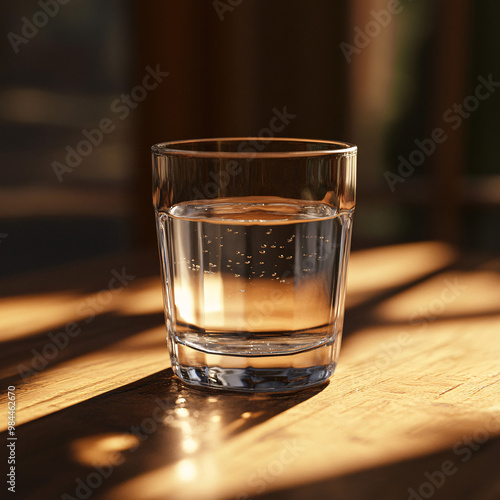 A glass with clean clear water and sharp shadows stands on a table. glass of water