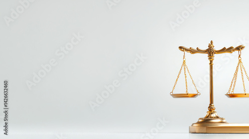 A gleaming golden scales of justice stands elegantly against a pristine white backdrop representing law, fairness, and impartiality in legal proceedings generally.