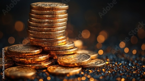 A Gleaming Stack of Golden Coins Against a Bokeh-Filled Backdrop