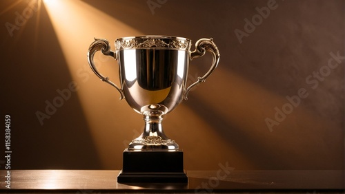 A gleaming trophy with two handles and a base sits on a dark surface, bathed in a warm, golden light.