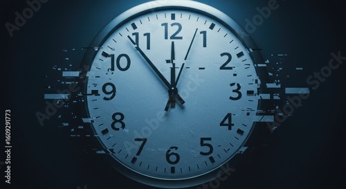 A glitching clock face on a dark background