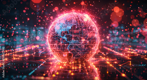 A globe of a planet surrounded by neural neon lines, grid and nodes.