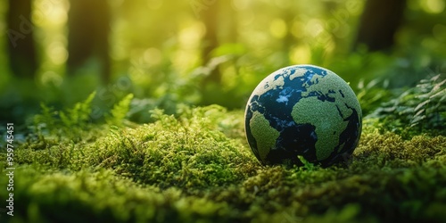 a globe representing Earth resting on a mossy green forest floor with vibrant sunlight filtering through the trees, highlighting the harmony between nature and environmental conservation.