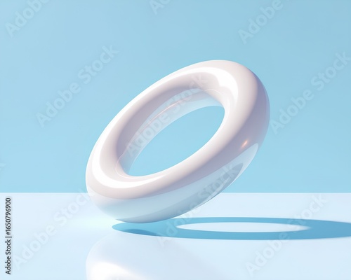 A glossy white torus ring floats playfully on a reflective surface against a clear blue sky background in a clean, modern 3D illustration.