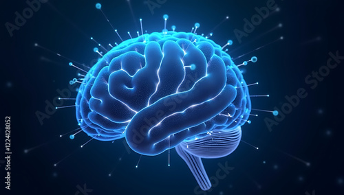 A glowing 3D AI brain interface made of interconnected circuits and digital nodes, pulsating with vibrant energy. Represents neural networks and machine learning.