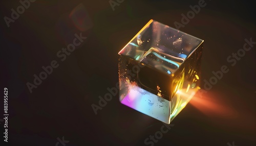 A glowing abstract crystal cube with colorful reflections and particles, set against a dark background, evoking a futuristic vibe.
