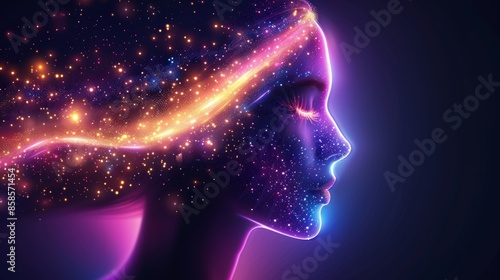 A glowing, abstract portrait of a woman's face with vibrant colors and particles.