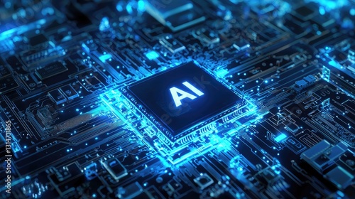 A glowing AI microchip on a futuristic circuit board, symbolizing artificial intelligence, deep learning, and advanced computing. Ideal for tech innovation and digital transformation themes
