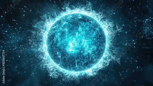 A glowing, azure sphere, surrounded by swirling energy, amidst a dark space