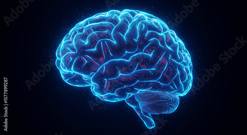 A glowing blue brain with visible convolutions against a dark background with small light particles