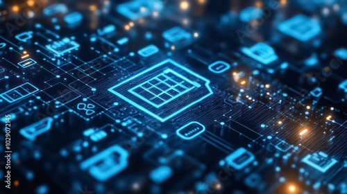 A glowing blue calculator icon is seen on a circuit board background with other digital icons.