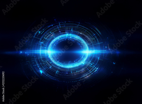 A glowing blue circular digital interface, a futuristic technological design with concentric rings and bright light effects on a black background, suggesting innovation and progress.