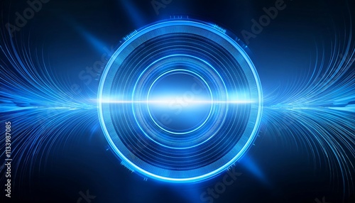 A glowing, blue, circular portal with light beams, on dark background.