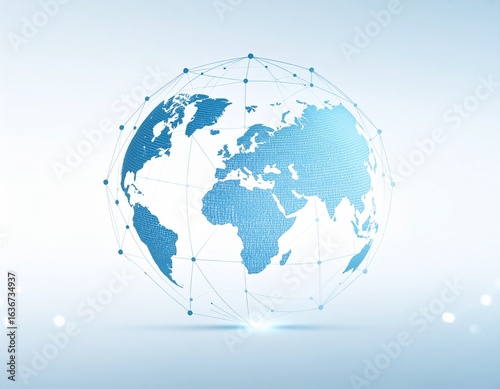 A glowing blue digital globe with interconnected nodes representing global network connections on a light blue background.