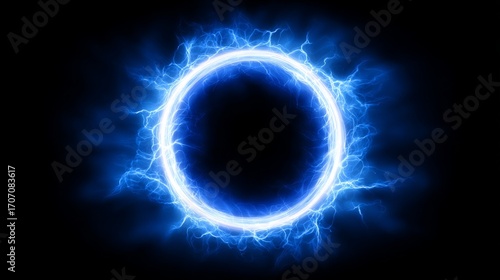 A glowing blue electric ring set against a dark background and characterized by dynamic energy patterns creates a visual effect that exudes a sense of futurism and power