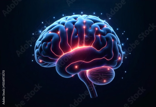 A glowing blue hued human brain with red neural connections and white light particles symbolizing brain activity or neurological processes