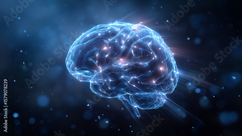 A glowing blue human brain illuminated with vibrant neon light, futuristic concept of intelligence, neural activity, creativity, and high-tech visualization.