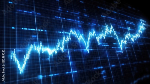A glowing blue line chart with sharp upward trends, overlaid with stock market data points and percentage growth symbols, on a digital interface with real-time updates.