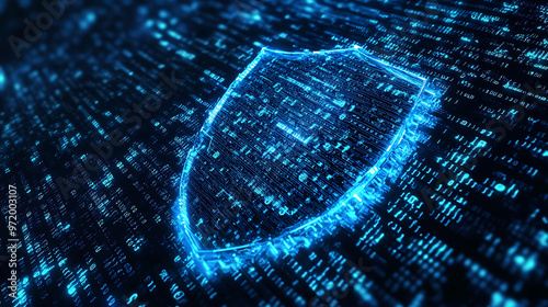 A glowing blue shield formed by binary code, representing digital protection.