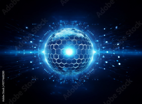 A glowing blue sphere with a hexagonal pattern surrounded by streaks of light and a dark background.