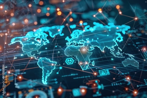 A glowing blue world map made of tiny dots and connected by glowing lines on a black background.