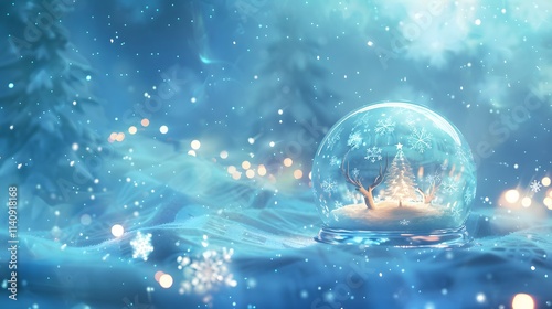 A glowing Christmas snow globe with a tiny winter wonderland inside, surrounded by delicate snowflakes, set against a luminous blue abstract night background with soft, glowing lights