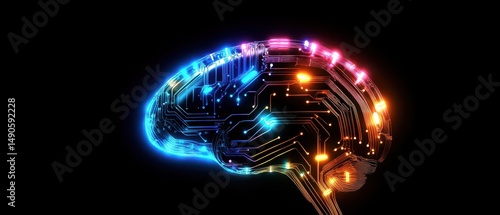 A glowing, circuit-like brain illustration symbolizes artificial intelligence, technology, and digital innovation on a black background.
