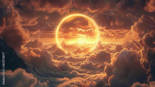 A glowing circular message frame with a backdrop of the sun surrounded by a sea of clouds.