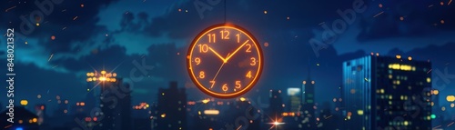 A glowing clock suspended in the night sky above a vibrant cityscape, symbolizing the passage of time against an illuminated urban backdrop.