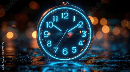 A glowing clock with blue neon light against a dark background with bokeh lights.