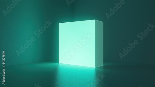 A glowing cube emits teal light in a minimal, empty room, creating a futuristic and modern atmosphere.