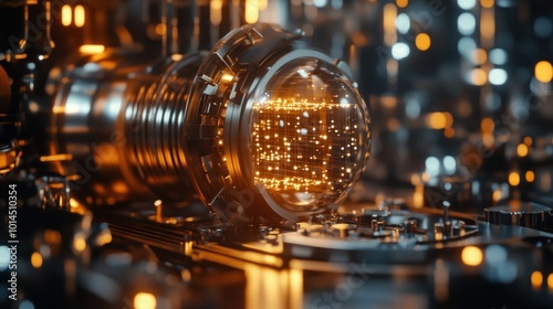 A glowing cube encased in a metallic sphere, resting on a complex mechanical surface.