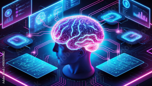 A glowing digital brain connected to various data interfaces, symbolizing artificial intelligence, neural networks, and the integration of technology in data analysis.