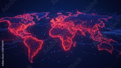 A glowing digital map of the world, showcasing intricate red and blue connections that represent data flow or networks.