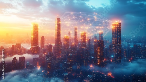 A glowing digital metropolis floating above a sea of clouds, with illuminated threads connecting every building. The city shines with neon colors, reflecting in the misty cloudscape below,