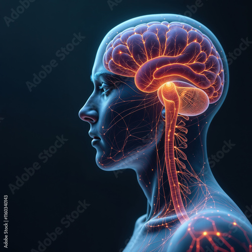 A glowing digital representation highlights the human brain and nervous system in a scientific and educational manner. Neural pathways are illuminated with bright lines against a dark background.