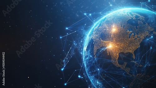 A glowing Earth with digital connections wrapping around it, representing global communication, copy space