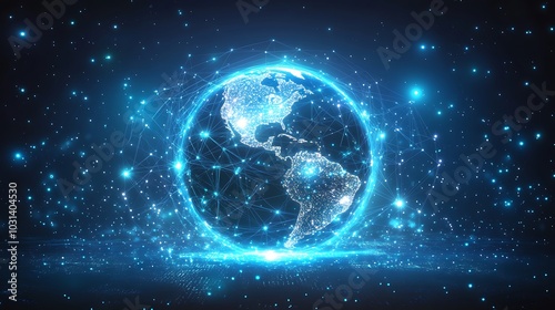A glowing earth with intricate digital lines connecting continents, showcasing global communication networks, set against a dark background.