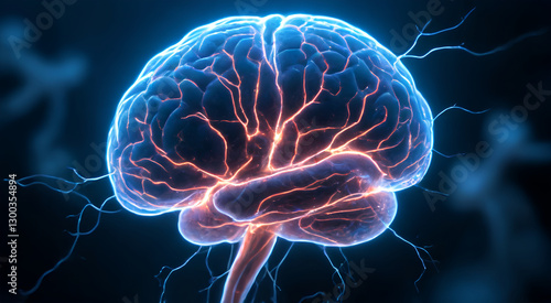 A glowing, electric brain illustration depicting neural activity with vibrant colors and intricate patterns.