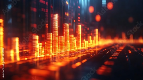 A glowing financial chart with a sharp logarithmic rise, golden coins stacked progressively higher along the curve, illuminated by warm ambient light, set against a futuristic, minimalist background,
