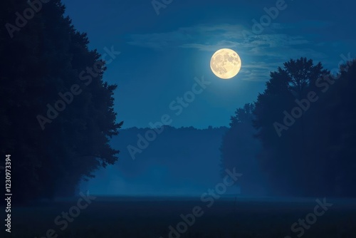 A glowing full moon illuminates a misty forest at midnight, full moon, trees
