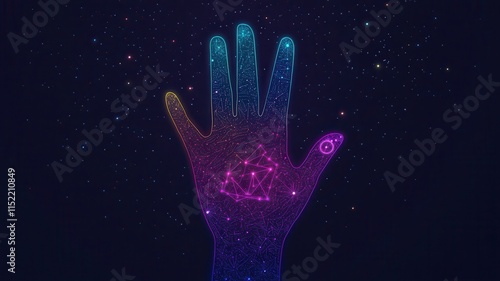 A glowing, futuristic hand is depicted against a dark background, showcasing vibrant colors and cosmic patterns, evoking a sense of technology and connection.