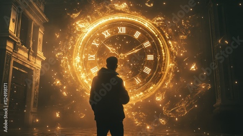A glowing gold Roman numeral clock in a cosmic vortex of people silhouettes, time travel mutiverse, background wallpaper AI generated image