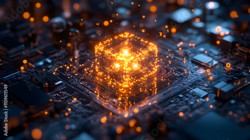 A glowing golden hexagonal structure emitting light particles, symbolizing futuristic data storage and energy.