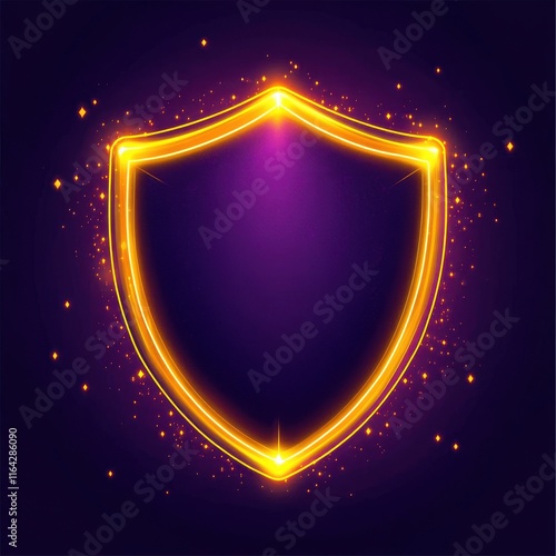 A glowing golden shield with a purple background, symbolizing protection and security.